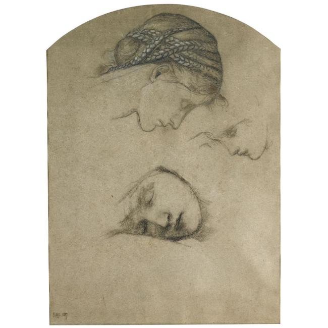 These various studies of girls’ faces were made in preparation for the painting entitled The Council Chamber, which is part of the series of paintings (existing in several versions) which tell the story of Sleeping Beauty and which Tennyson, in his poem based on the legend called ‘The Day-Dream’, had given the name 'The Briar Rose'. The positioning of the heads corresponds most closely to the version of The Council Chamber upon which Burne-Jones worked intermittently from 1872 to 1892 and which is now in the Bancroft collection in the Delaware Art Museum (see fig.00). This painting was itself a revision on larger scale of the second part of three panels in what is called ‘The Little Briar Rose Series’, done for William Graham and completed in 1871. These are now in the Museo de Arte at Ponce, Puerto Rico. In his first revision of the scheme, Burne-Jones’s intention seems to have been to make a new series of four compositions, but only The Council Chamber was completed. However, in 1884, he decided to start on an entirely new Briar Rose series, again in four parts, based on the earlier compositions but with many revisions. A series of entries in Burne-Jones’s work record from the mid and late 1880s chronicle this project, and one particularly in 1887, where he records that he ‘redrew all the figures of the sleeping girls in the third picture of the sleeping palace’ (quoted Stephen Wildman, The Art of the Pre-Raphaelites from the Delaware Art Museum, exhibition catalogue, Art Services International, 2004, p.120), refers to the process of revision of which the present drawing was part.